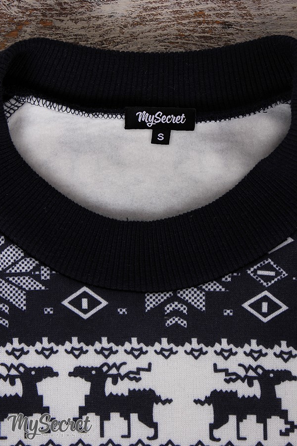 Свободный свитшот-реглан из комбинации трикотажа стежка и очень теплого трикотажа трехнитка с начесом с веселым и очень зимним принтом "Олени". Горловина, манжеты и резинка по низу изделия - из контрастной рибаны. Цвет: белый с темно-синим.